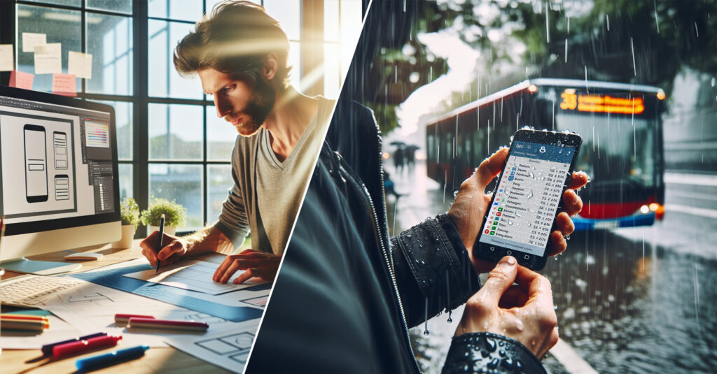 The app providing the data has been designed indoors, most likely the designer has been sitting next to a desk in a room with proper lighting and preferable room temperature. Your situation, however, is completely different and you struggle to complete your task as the buttons in the app are too small for your numb fingers and the small texts are hard to read in the poor lighting conditions of the bus stop. The designer couldn’t have changed the weather or the lighting, but they could have considered the app will most likely be used outdoors as busses tend to run outside.