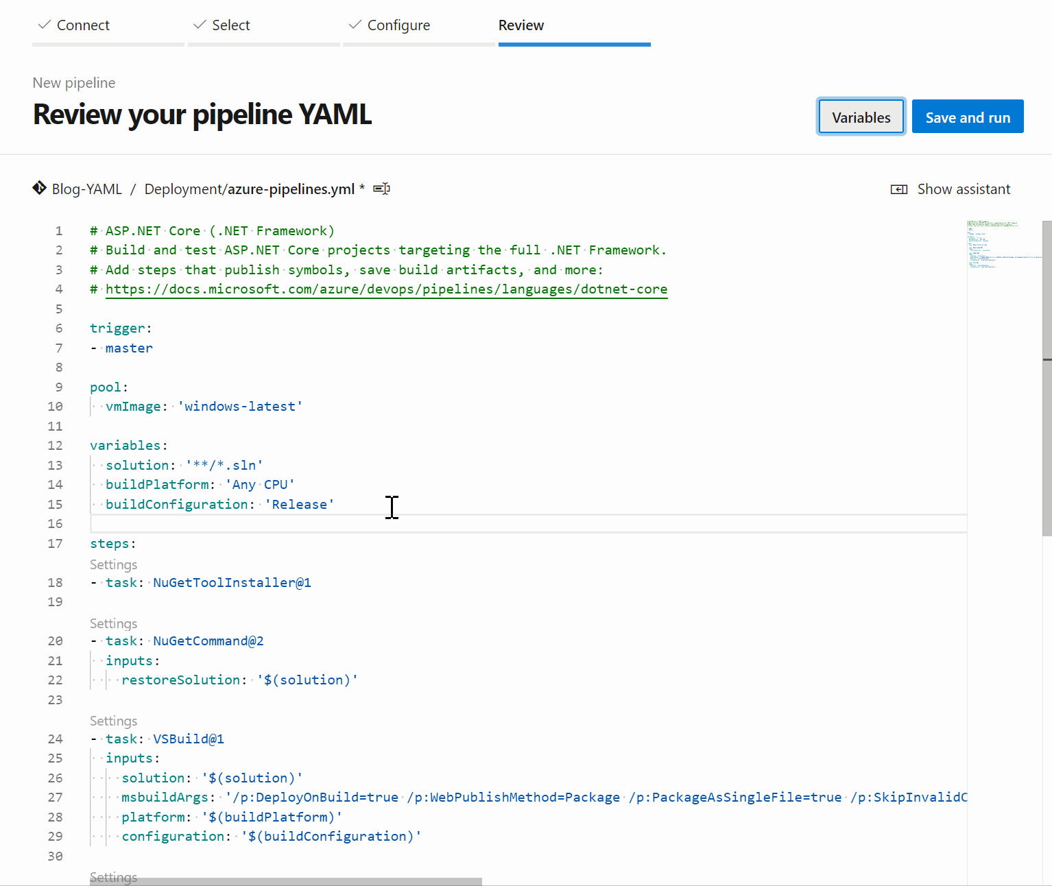 Luckily, Microsoft has provided us with a somewhat confusing pile of documentation we can utilize, along with some starter templates we can use as a base. They also have created an extension for VSCode that you can use, but the best way is still to use the Azure DevOps portal, as it has a very useful task assistant tool to create the individual step configurations. This makes it especially easy to learn the syntax.