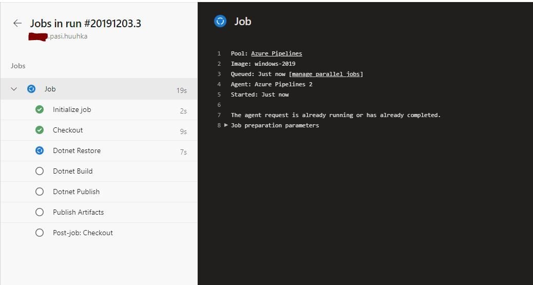 I started with an ASP.NET template, as it already had most of the variables configured that I needed. The trigger was also set to run every time the master is updated. However, I used the assistant functionality to configure dotnet core CLI tasks instead of the suggested ones and specified the windows-2019 agent pool instead of the default windows-latest. In addition to this, I added display name fields so the logs would be clearer. In the end, I used the new PublishPipelineArtifact task to publish my zipped projects for a release pipeline to utilize.